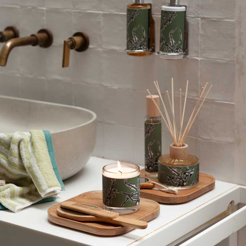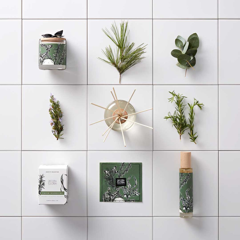 El frescor del eucalipto y el alcanfor se unen a los aromas del pino y el romero para crear una atmósfera de calma y confort. La bergamota aporta notas cítricas y verdes a la fragancia.