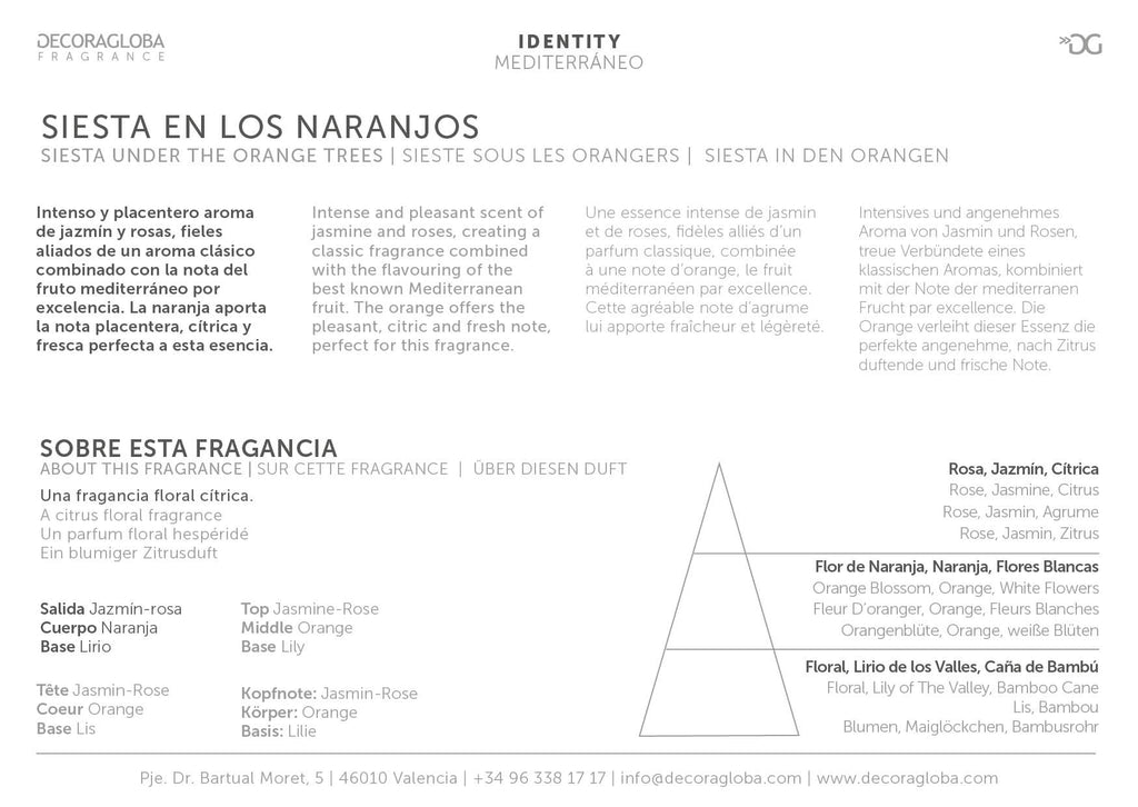 Te trasladará a un perfumado campo de naranjos, el paisaje mediterráneo por excelencia. Una atmósfera de paz y ensueño.