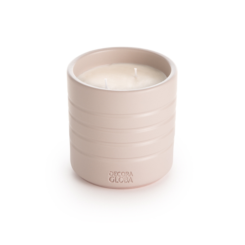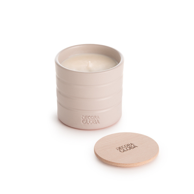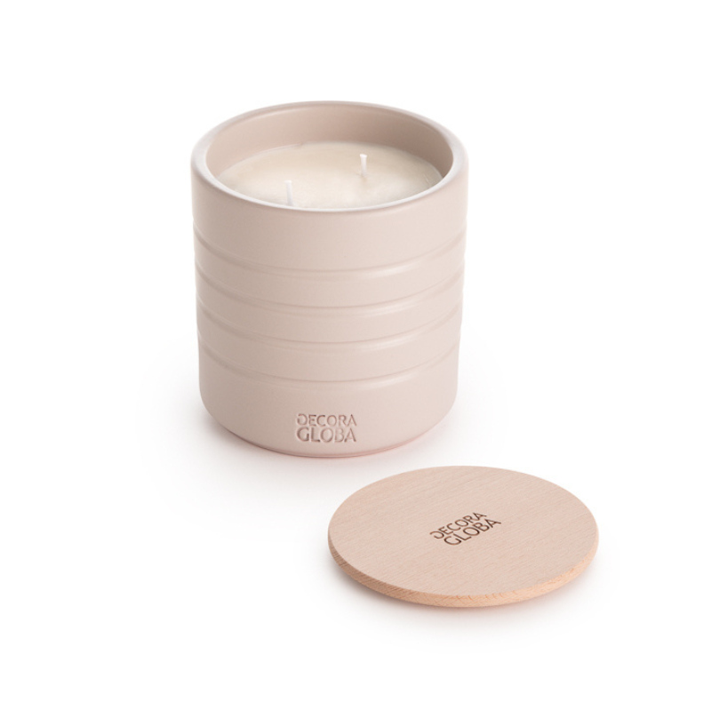 Vela decorativa de cerámica con fragancia ATENEA, una combinación única de aroma fresco y cítrico con toques verdes, jazmín, menta, cardamomo y fondo amaderado de sándalo, cedro y almizcle. Ideal para crear un ambiente elegante.